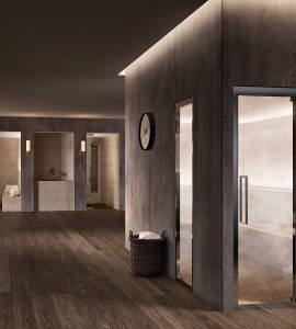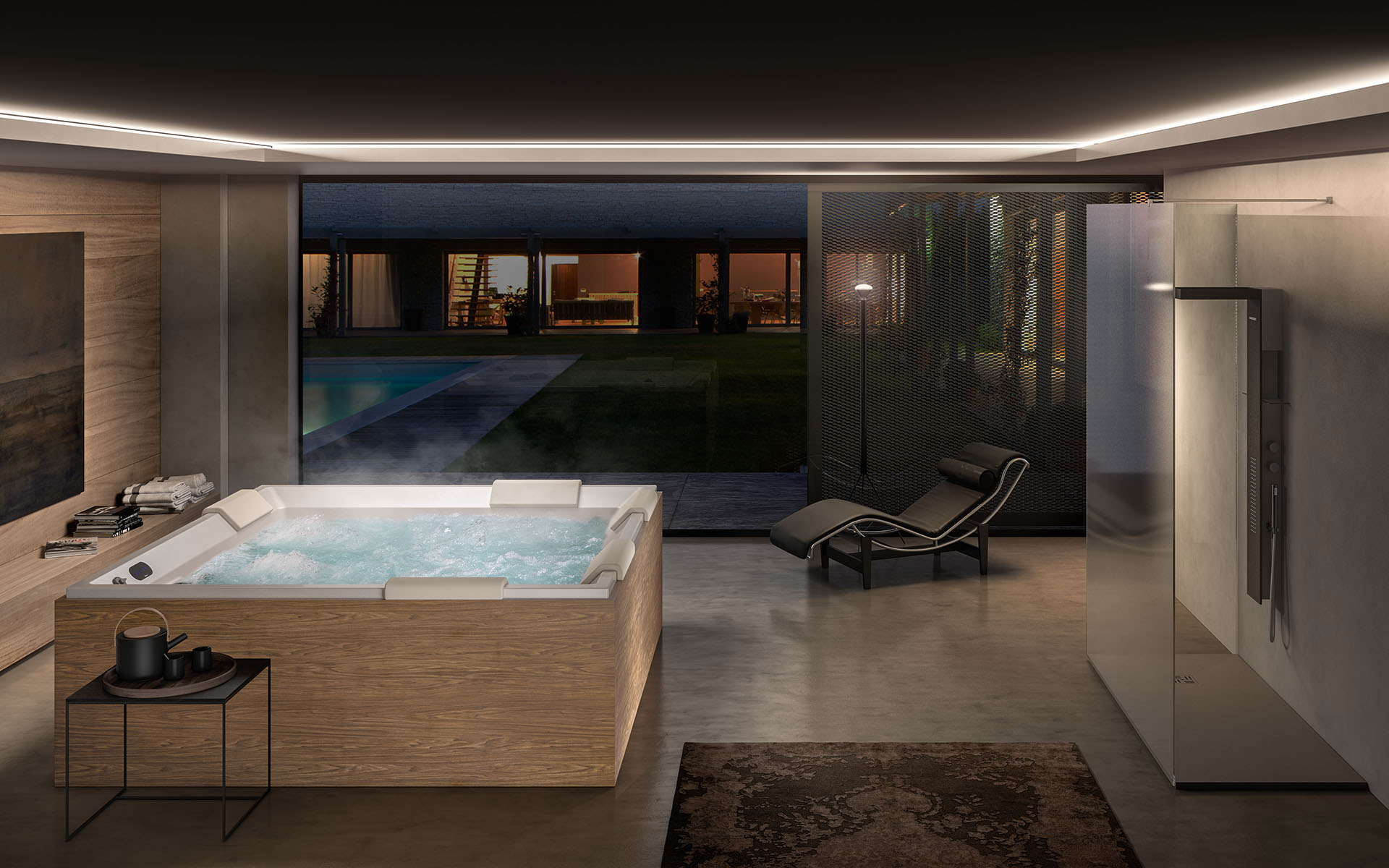 Una minipiscina dalla forma quadrata e rigorosa con diverse combinazioni di sedute.